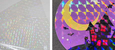 角度によってきらきらと七色に光る透明ホログラムラミネートフィルムです。スクウェア柄、波柄などがあります。