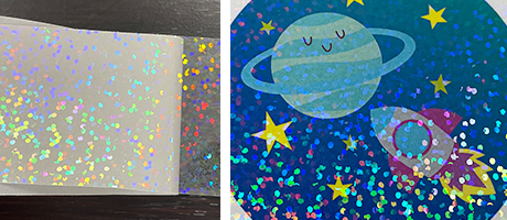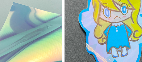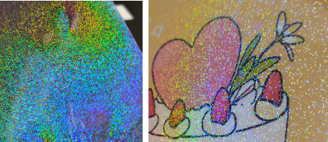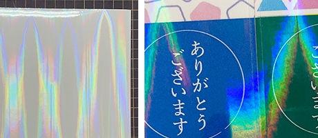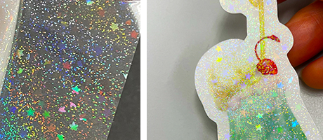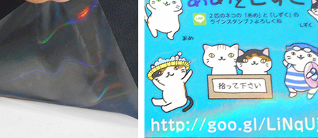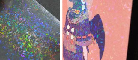 濃い色(黒など)の上に貼るとホログラムがはっきりきれいに見えます。