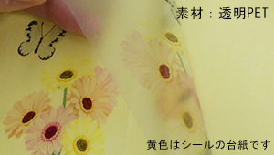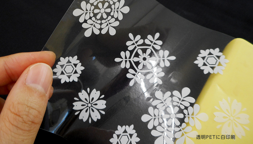 インクには透過性があり、白地の素材に印刷した場合はそのままの色で印刷できますが、透明の場合はセロファンのように透けたり、金や銀の素材のものではメタリックな色で印刷されます。