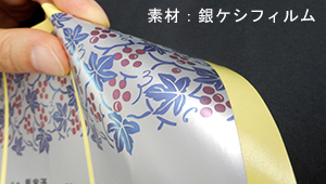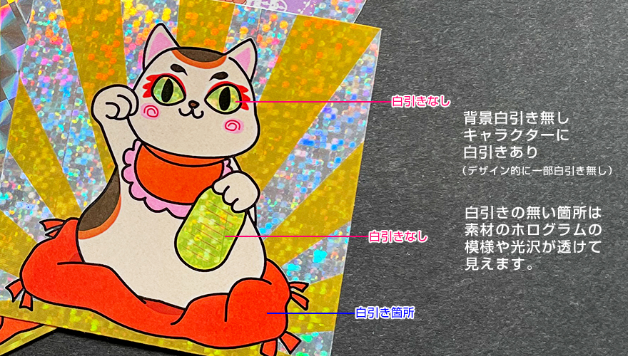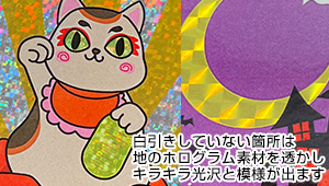 銀素材の上に印刷するとメタリックな色に、金素材はすでに黄色が素材に使われている為、黄色が混ざったメタリック調になります。ホログラム素材の上に色印刷するとホログラムの光沢と模様が出ます。