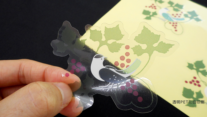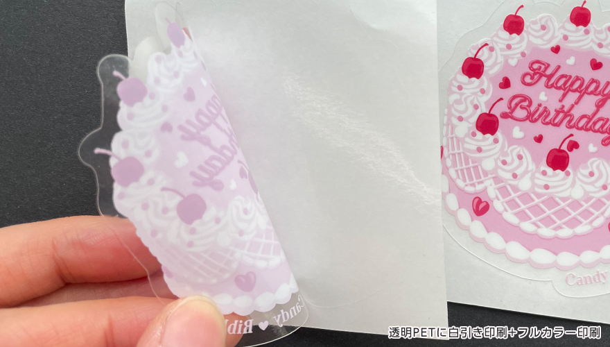 カラーセロファンやステンドグラスのような透け感のある色になります。透明ステッカーを貼る面が白色の場合は白引き印刷をする必要がなくなります。
